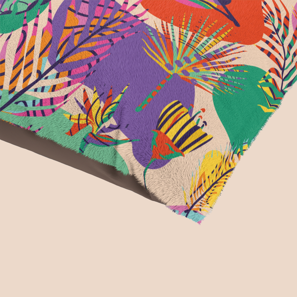Printed feather soft fleece exterior with dark brown zippered back and a pillow insert.
