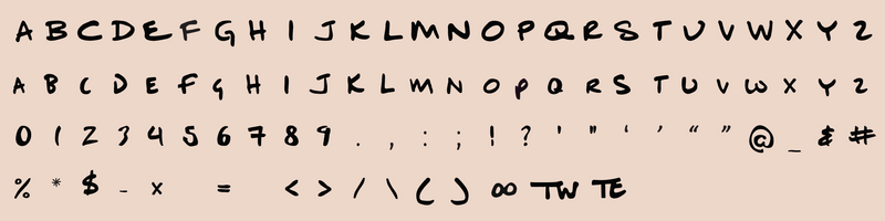 The font includes uppercase and lowercase letters, numbers 1–9, and a selection of common punctuation marks.